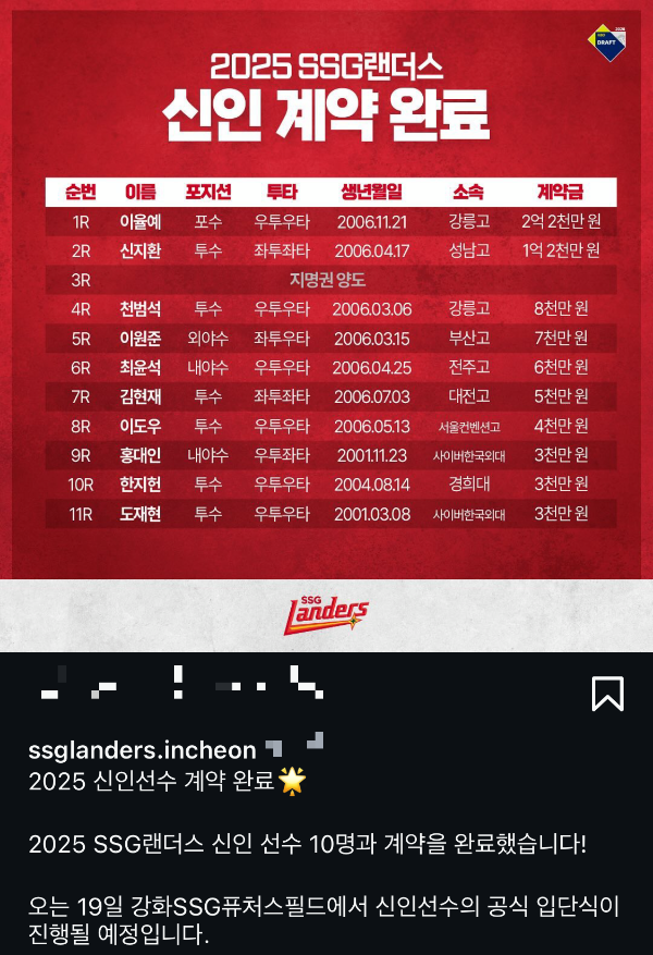 SSG 랜더스 구단은 2024년 10월 6일(일), 2025년 신인 선수들과 계약 완료를 발표했습니다.