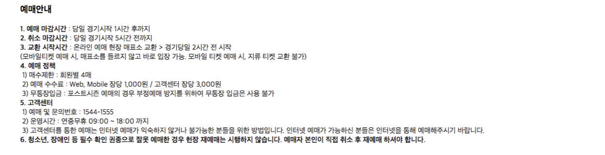 ▶ 예매 마감 시간 : 당일 경기시작 1시간 후까지 가능합니다.