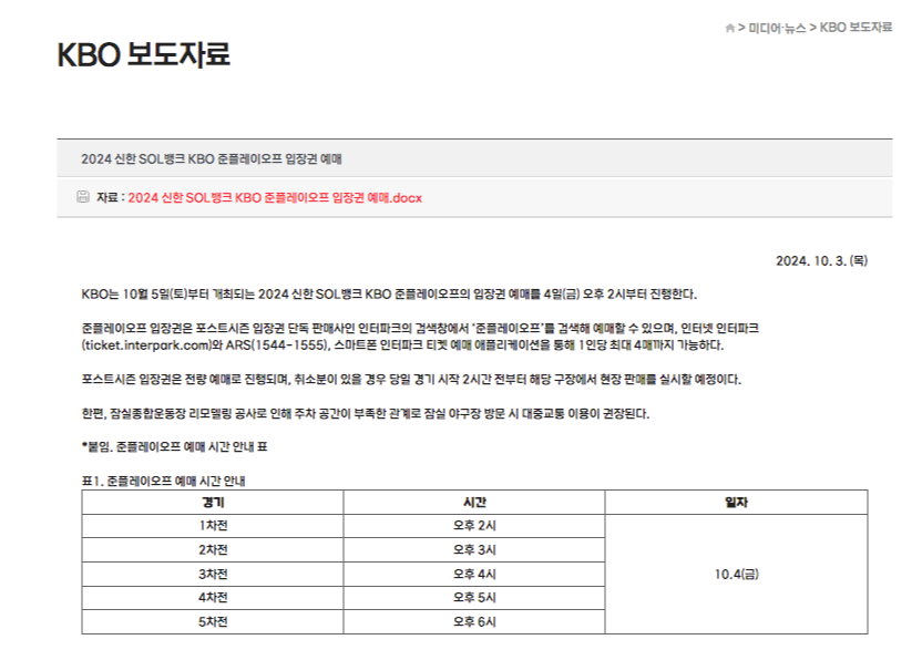 2024 신한 SOL뱅크 KBO 준플레이오프 입장권 예매 (2024년 10월 3일, KBO 홈페이지, 보도자료)
