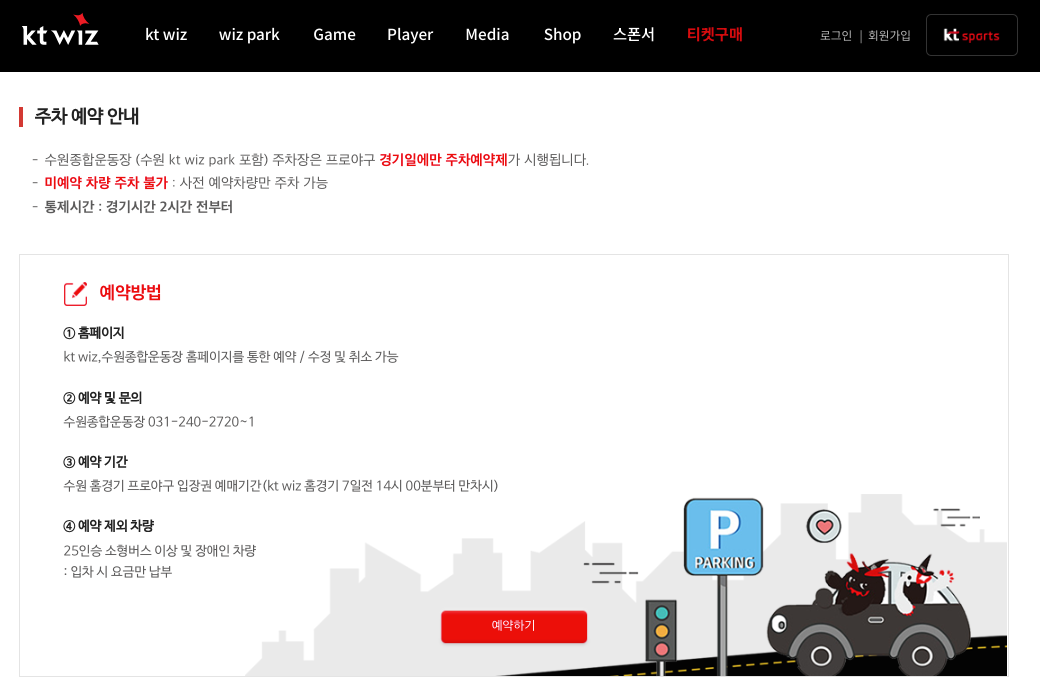 수원 KT 위즈 파크 주차장은 프로야구 경기 당일 사전 예약 차량만 주차 가능하다고 합니다.