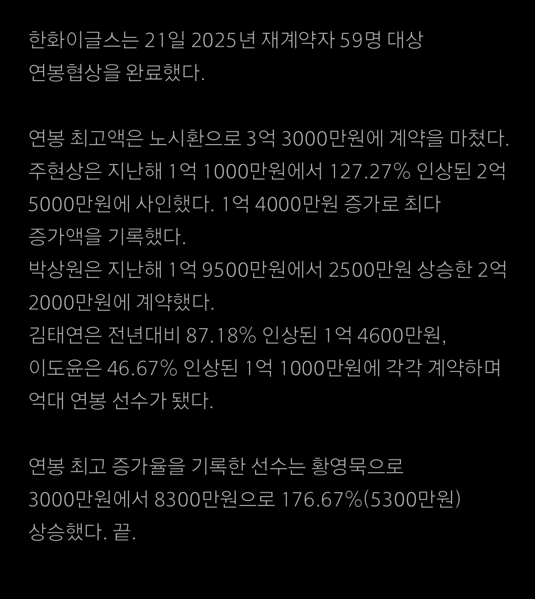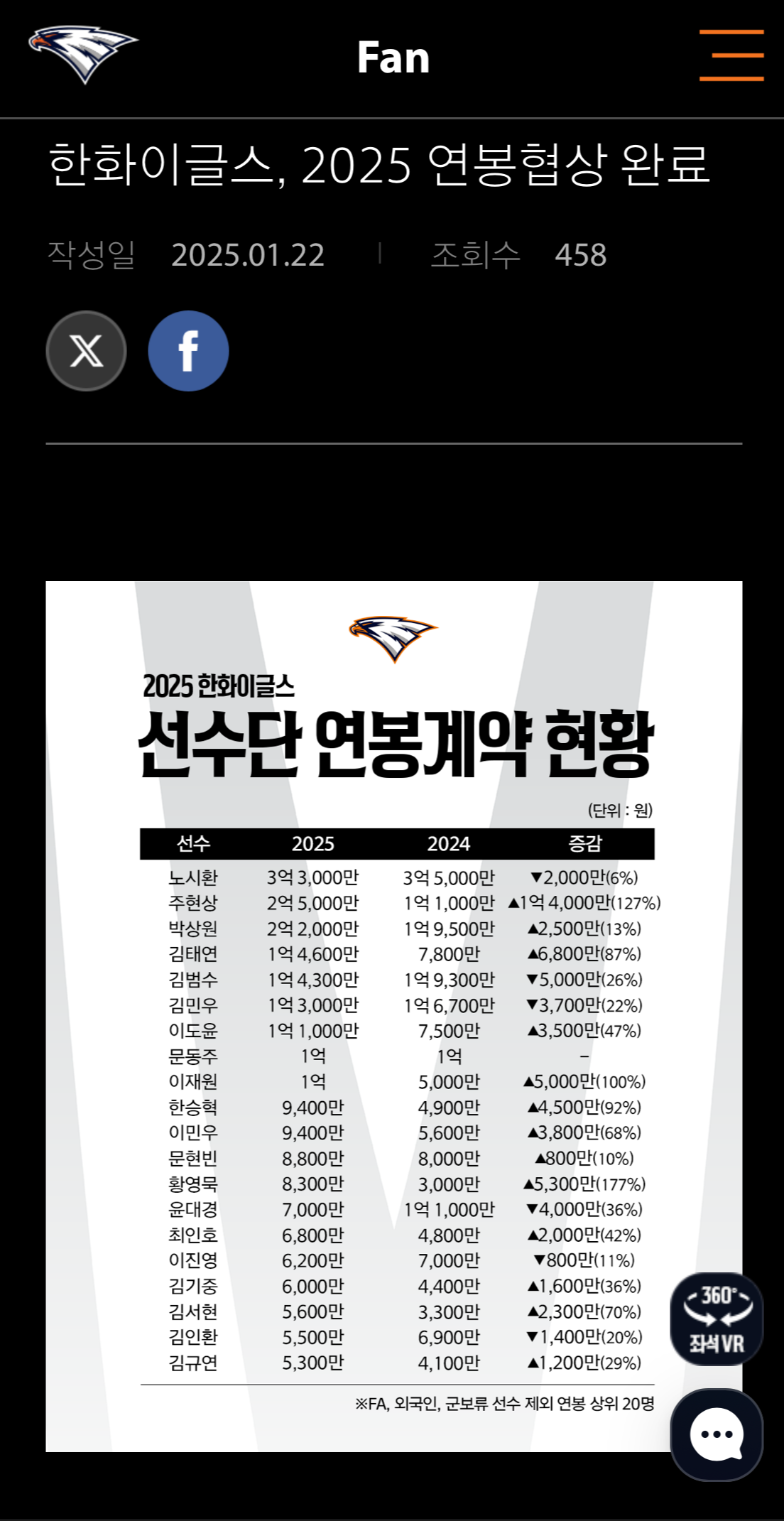 한화이글스, 2025 연봉협상 완료 (2025년 1월 22일, 한화 이글스 구단 홈페이지, 구단소식) (클릭) https://www.hanwhaeagles.co.kr/FA/CN/PCFACN02.do?&id=1716 |